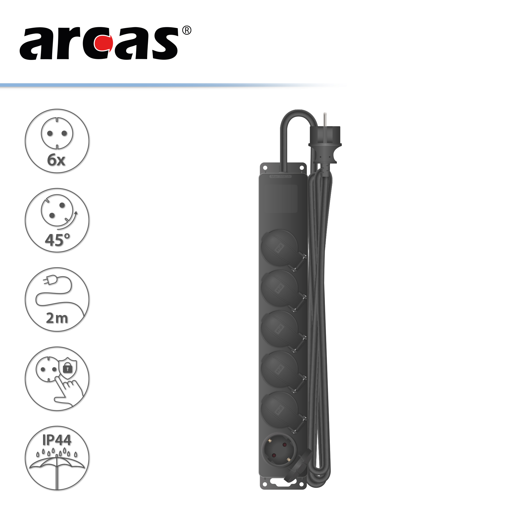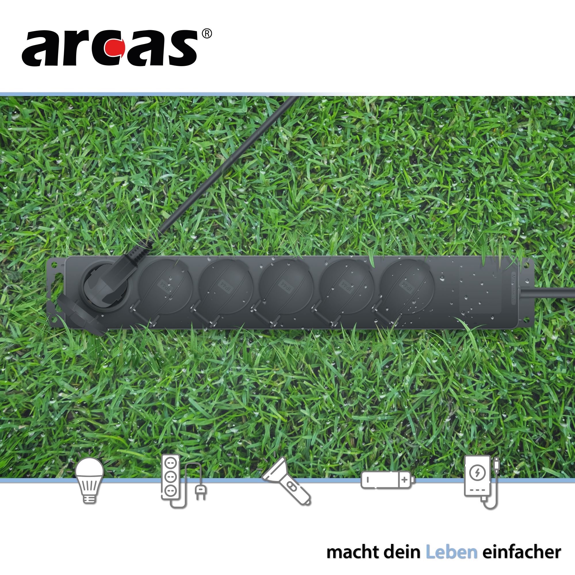 ARCAS Outdoor Steckdosenleiste 6-fach mit Klappe / Farbe: schwarz / IP44 / Querschnitt 1,5mm² / 6x Schukostecker